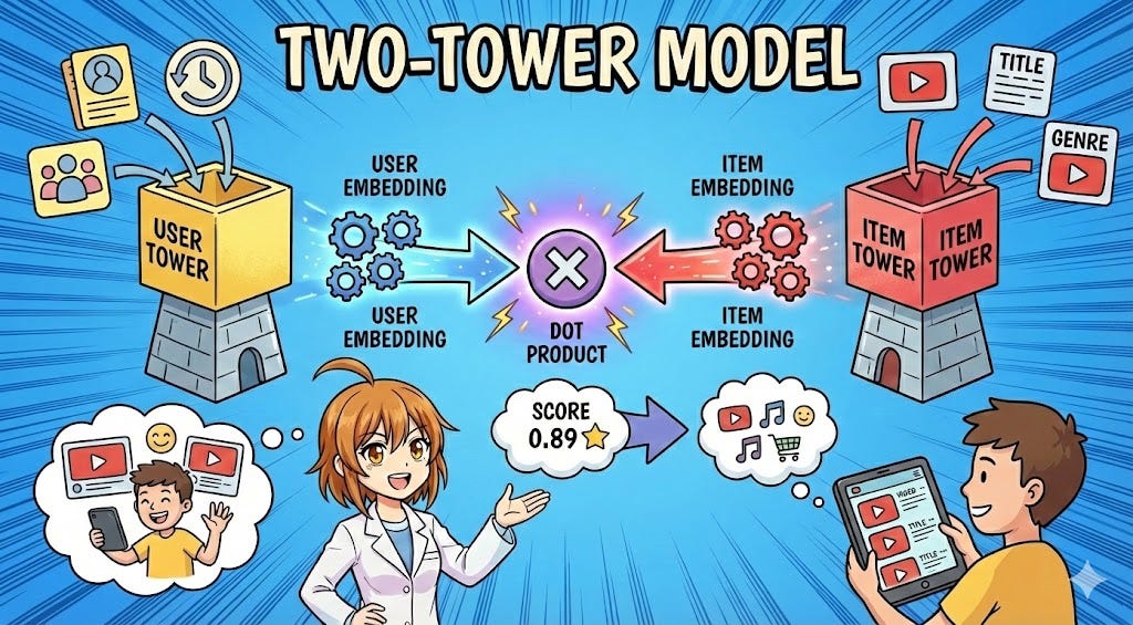 In my previous posts in this series, we discussed the high-level architecture of recommendation systems, the history of recommendation systems and the fundamentals of Recsys . But theory only goes so far; nothing truly clicks until you see the implementation and understand the engineering trade-offs required at scale. Today, we’re diving into the dominant architecture powering candidate generation at YouTube, Pinterest, Airbnb, and virtually every large-scale system: The Two-Tower Model.