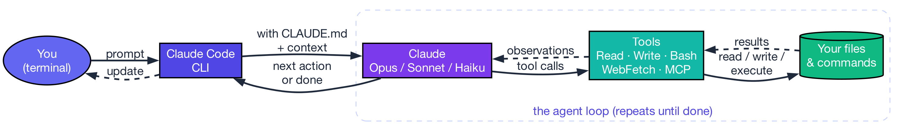That loop above — shown in the diagram at the start of this section — is the whole product. Read, think, act, observe, repeat. Your job is to give it good context up front and steer when it drifts.
